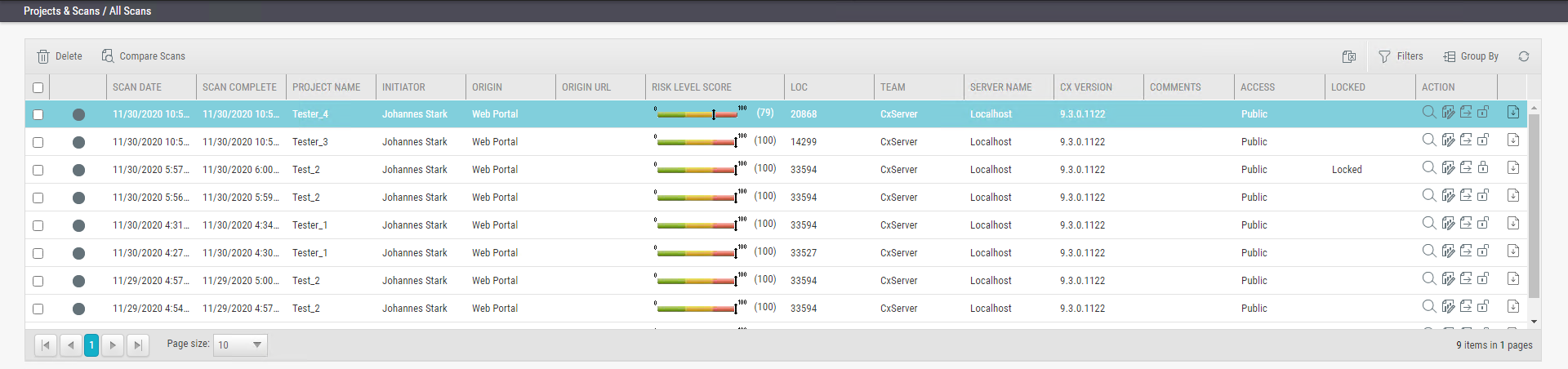 Under Projects & Scans > All Scans, all scan results appear in a table with each row representing an individual scan result set. You can sort tables according to Scan Date, Scan Complete Date, Project Name or Risk Level Score. Additional options are available under Managing Tables.