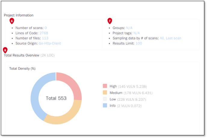 Project Information displays how many scans were run for this project including the number of lines of code and the amount of files that were scanned. The source origin of the project can include a repository or a web portal. A zip file does not display a source origin (6).
