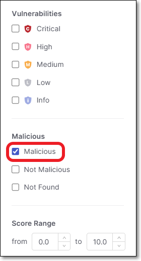 When a malicious package is identified, that package is marked with a "malicious" icon.