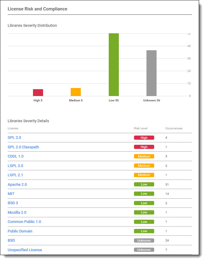 The License Risk and Compliance panel provides the distribution of project’s open source libraries by type of license and the level of risk associated with each license.